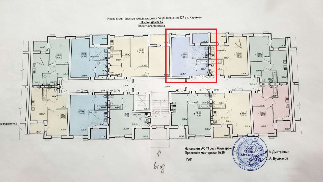 Загальна площа квартири – 38.12 кв.м, формат – студія: житлова зона – 22.48 кв.м, зона кухні – 6.74 кв.м з виходом на балкон, сан вузол спільний, висота стелі 2.7м.