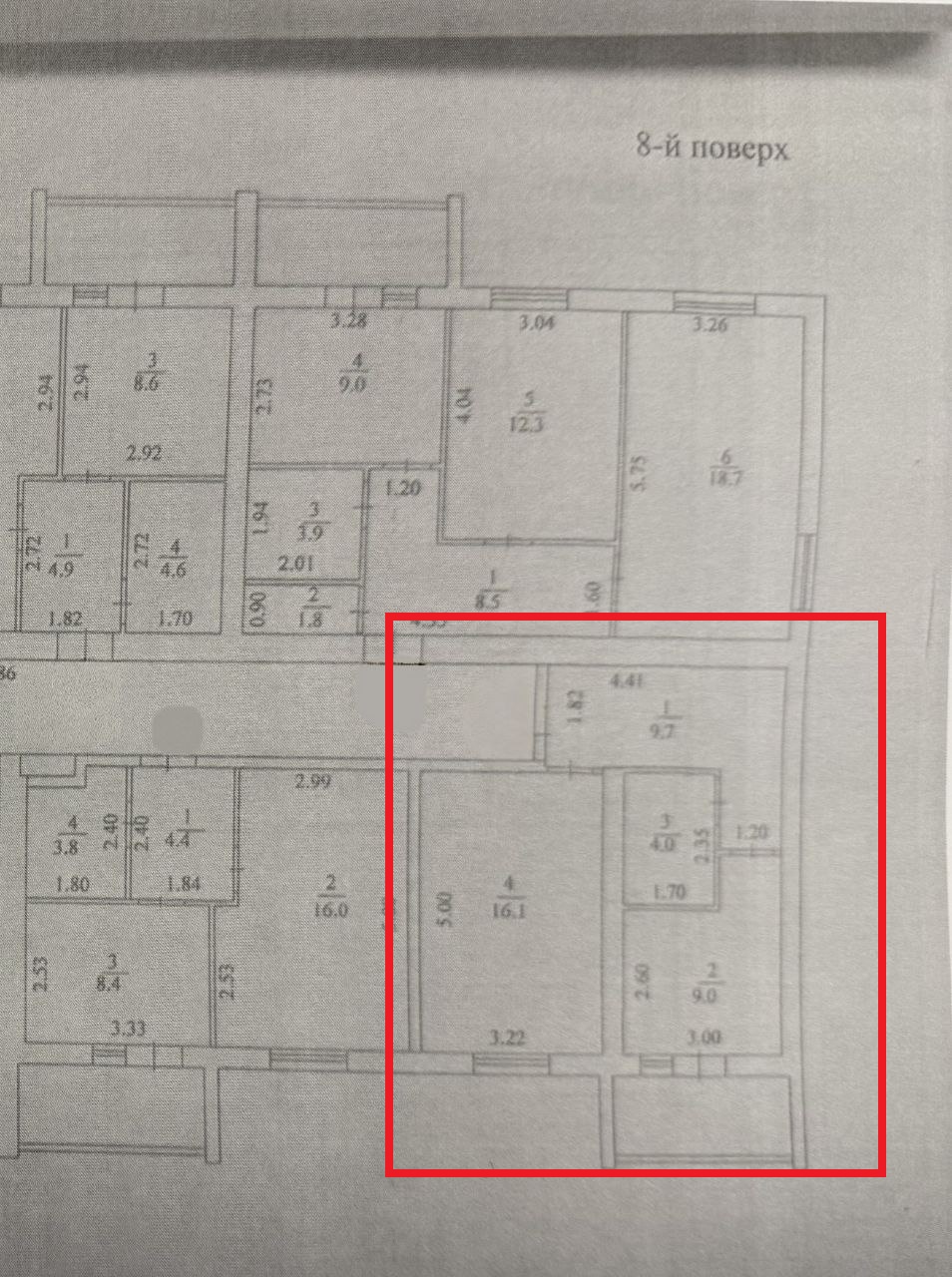 Загальна площа квартири – 41 кв.м, кімната – 16.1 кв. м, кухня – 9 кв.м з виходом на балкон, санвузол спільний, висота стелі 2.7м.