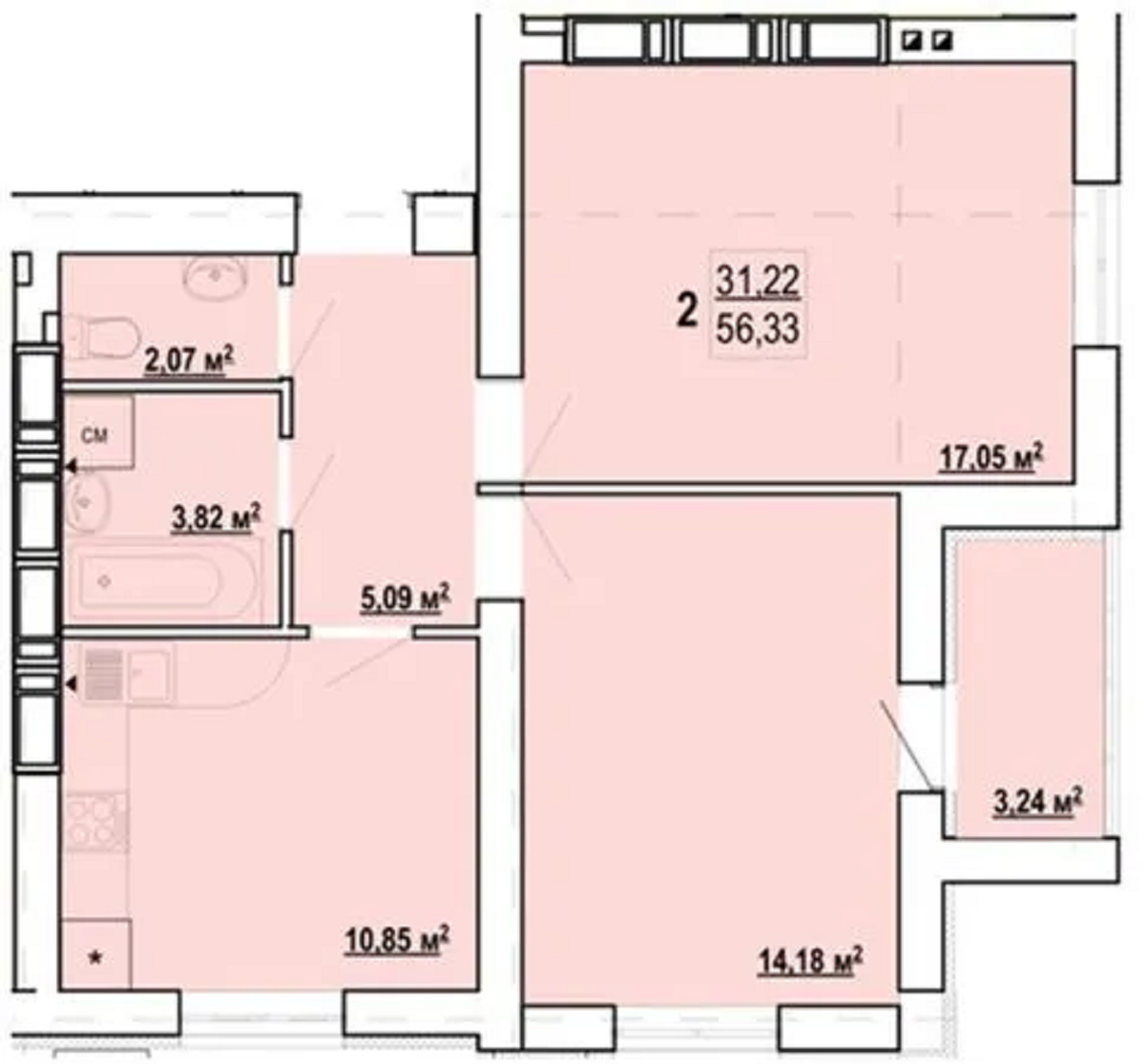 • Розмір нерухомості: 57 м²