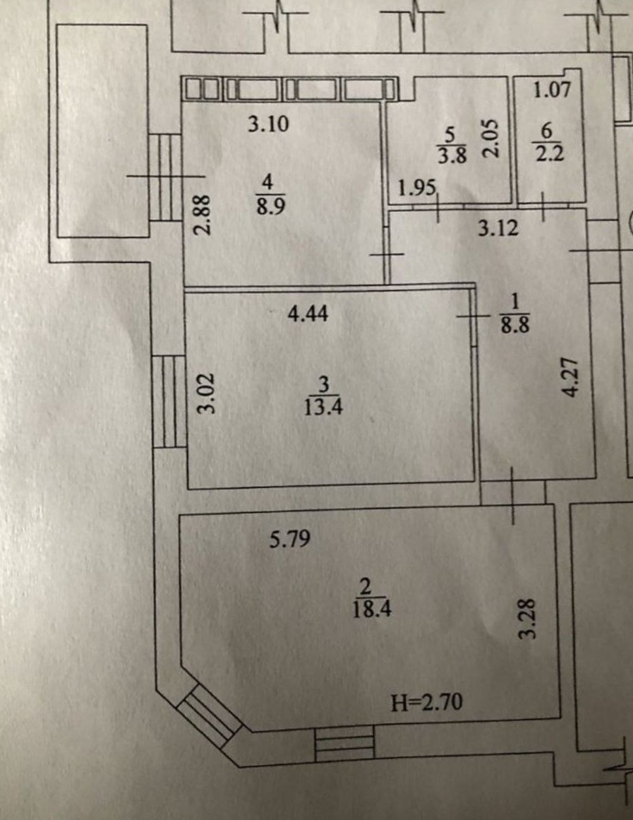 Загальна площа квартири – 58 кв м, 2е роздільні кімнати – 13.4 кв м та 18.4 кв м, кухня – 8.9 кв м з виходом на балкон, санвузол роздільний, висота стель 2.7 м.