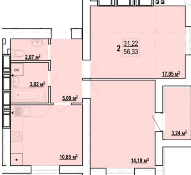 Розташована на 14 поверсі 16-поверхового будинку. Загальна площа 57 кв. м.