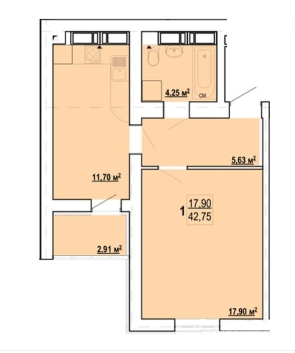Загальна площа 42.75 м2. Кухня: 12 м2.