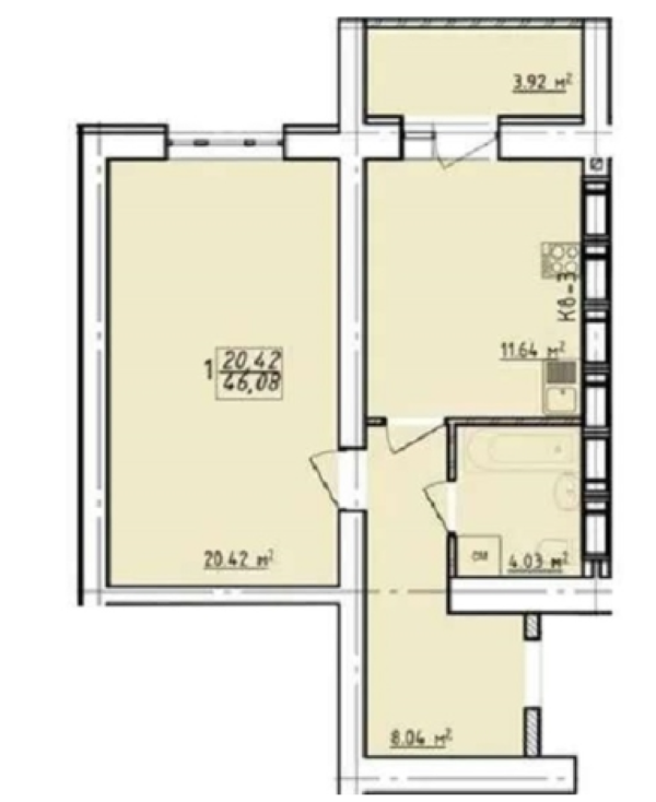 Загальна площа 46 м2, кухня 11 м2, кімната 20 м2.