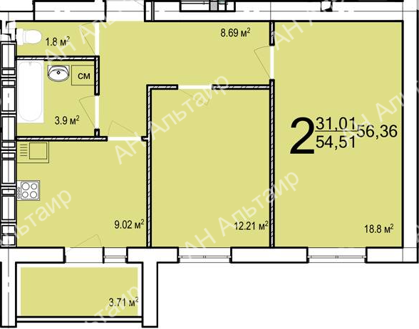 Загальна площа 56 м2. Кухня 9 м2, житлова 30 м2.