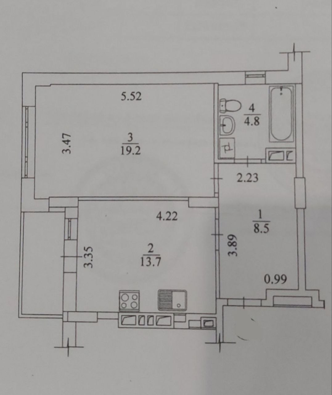 Загальна площа квартири – 50 кв м, простора кімната – 19.2 кв м, простора кухня – 13.7 кв м з виходом на балкон, сан вузол спільний з вікном, просторий коридор, висота стелі 2.8м.