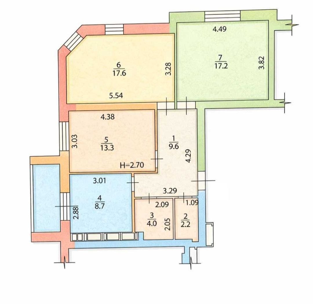Загальна площа квартири – 75 кв м, 3-і роздільні кімнати – 13,3 кв м, 17.6 кв м та 17.2 кв м, кухня – 8.7 кв м з виходом на балкон, санвузол роздільний, висота стель 2.7 м.