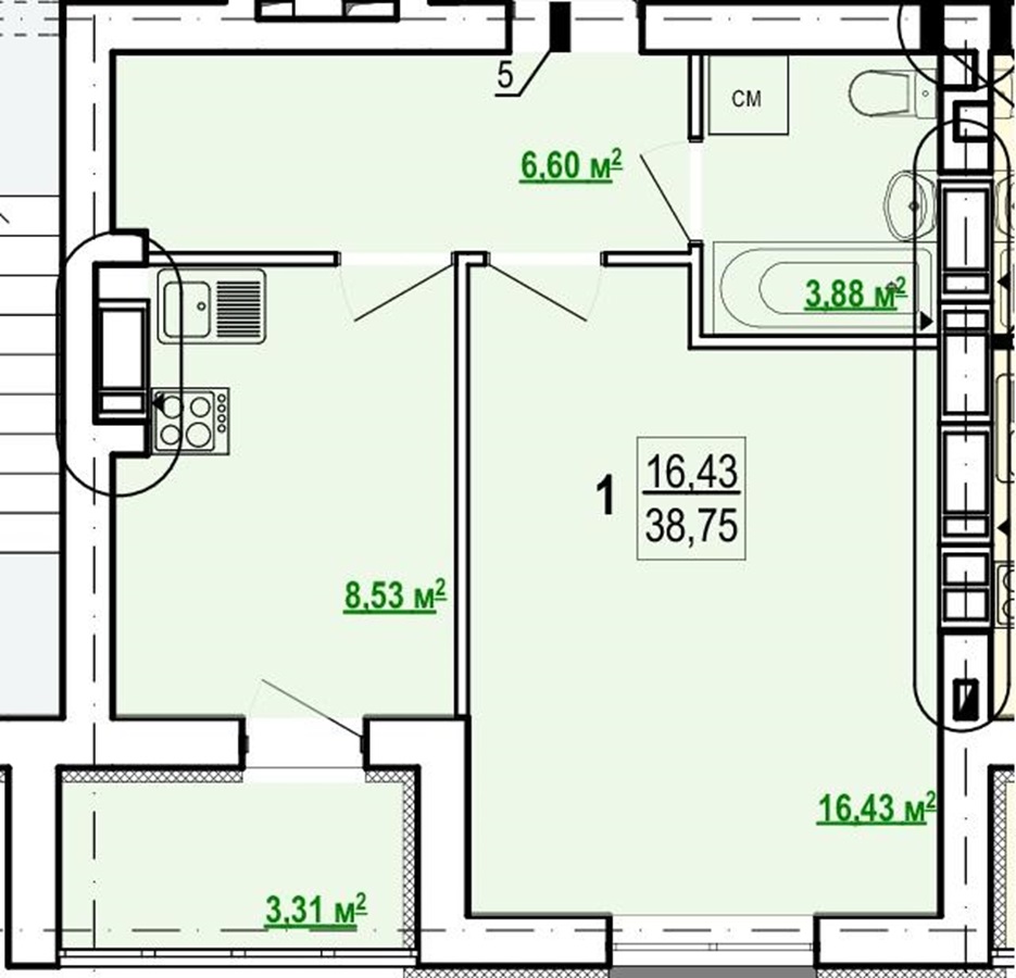 Загальна площа квартири – 38.1 кв.м, простора кімната – 16.4 кв м, кухня – 8.5 кв.м з виходом на балкон, сан вузол спільний, вбиральня, висота стелі 2.7м.