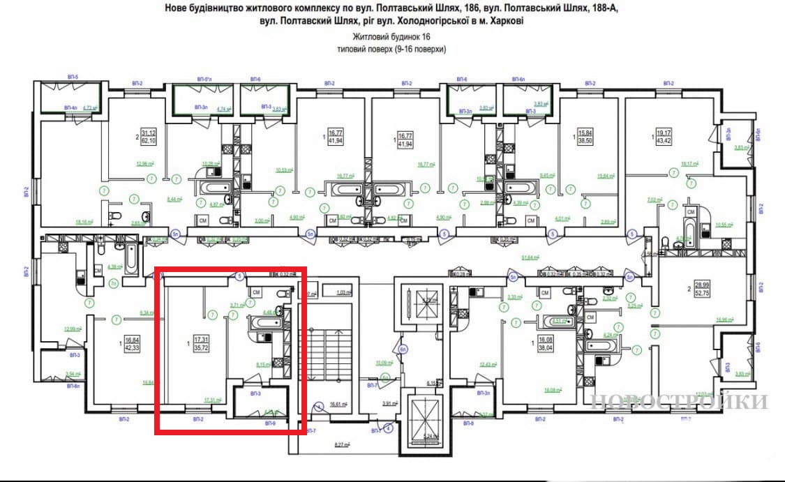 Загальна площа квартири – 35.72 кв.м, простора кімната – 17.31 кв м, кухня – 8.15 кв м з виходом на балкон, сан вузол спільний, висота стель 2.7м.