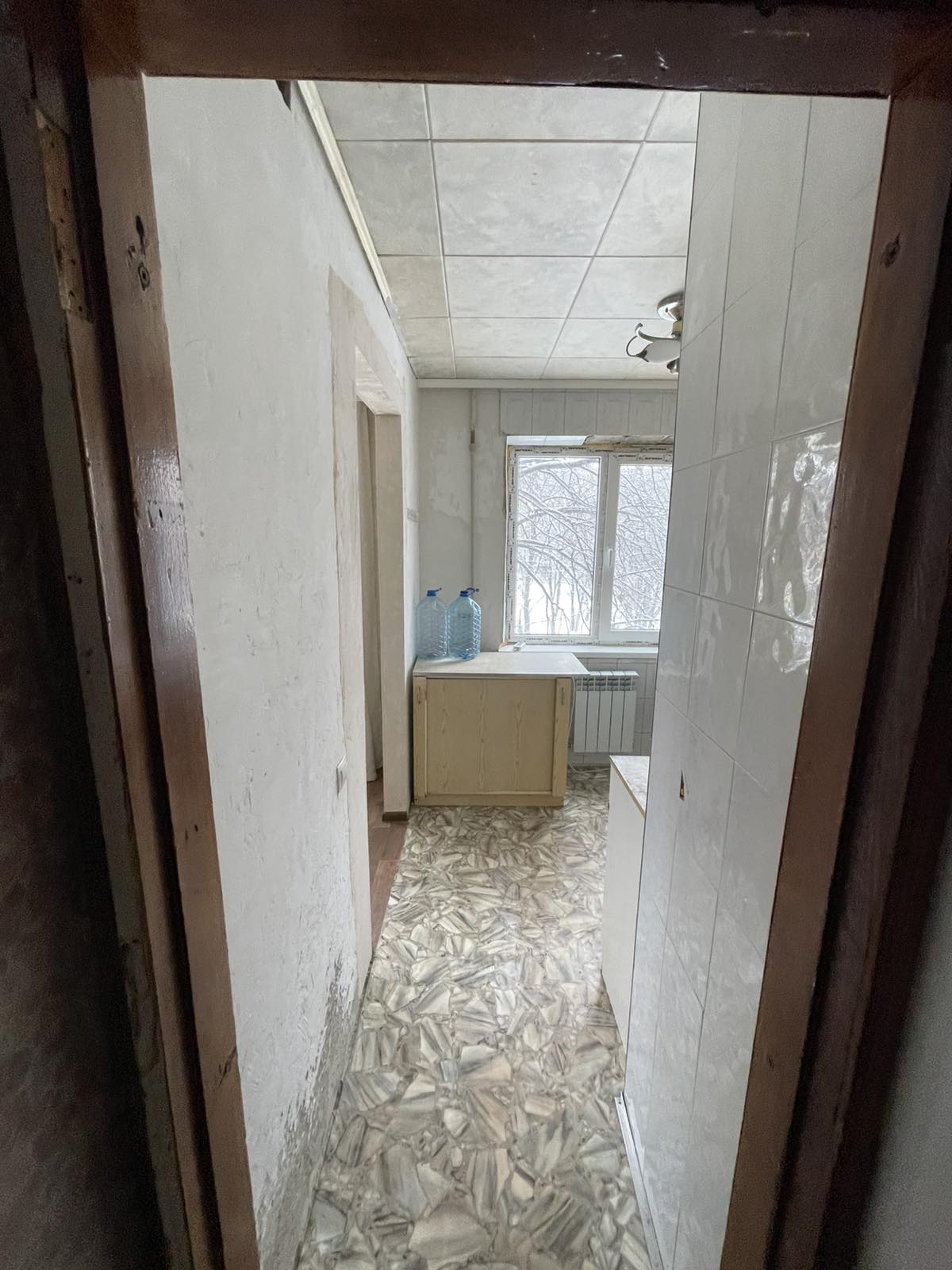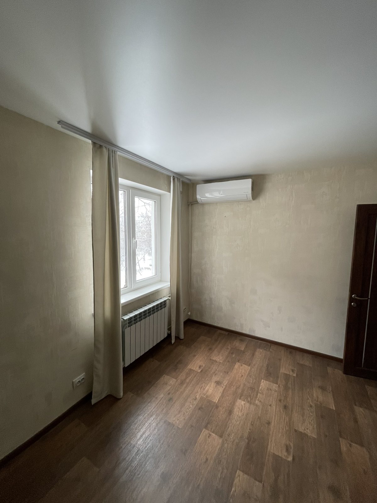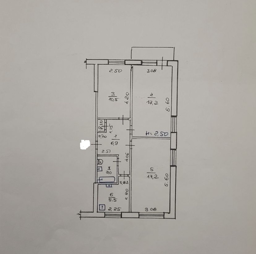 Загальна площа – 61.8 кв м, 3-і роздільні кімнати – 17.2 кв м, 17.2 кв м з виходом на балкон і 10.5 кв м, кухня – 5.5 кв м, сан вузол спільний, комора, коридор, висота стелі 2.5м.