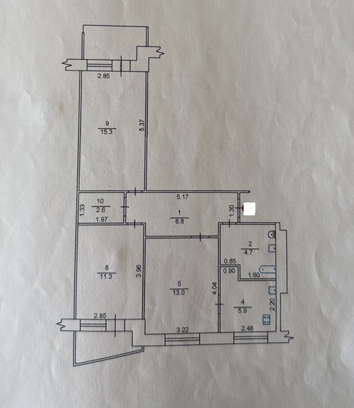 У продажу 3 кім квартира пл 63.9м2, формат: кухня – вітальня – 18.9 кв м та 2е роздільні кімнати – 11.3 кв м з виходом на балкон та 15.3 кв м з виходом на балкон, вбиральня, сан вузол спільний, висота стелі 2.6м.
