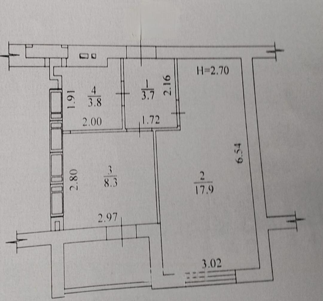 Загальна площа квартири – 37 кв.м, простора кімната – 17.9 кв м, кухня – 8.3 кв м з виходом на балкон, висота стелі 2.7 м.