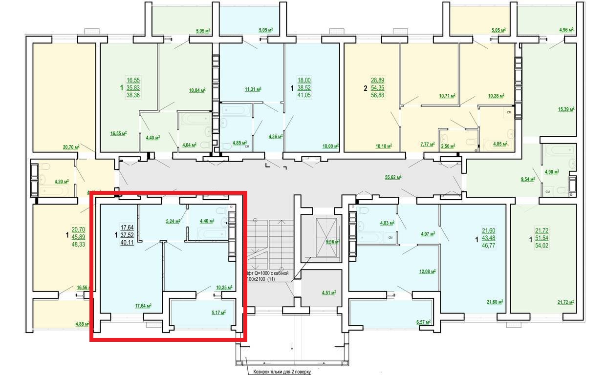 Загальна площа квартири – 40.5 кв.м, простора кімната – 17.8 кв, простора кухня – 10.4 кв.м з виходом на балкон, санвузол спільний, висота стель 2.7м.