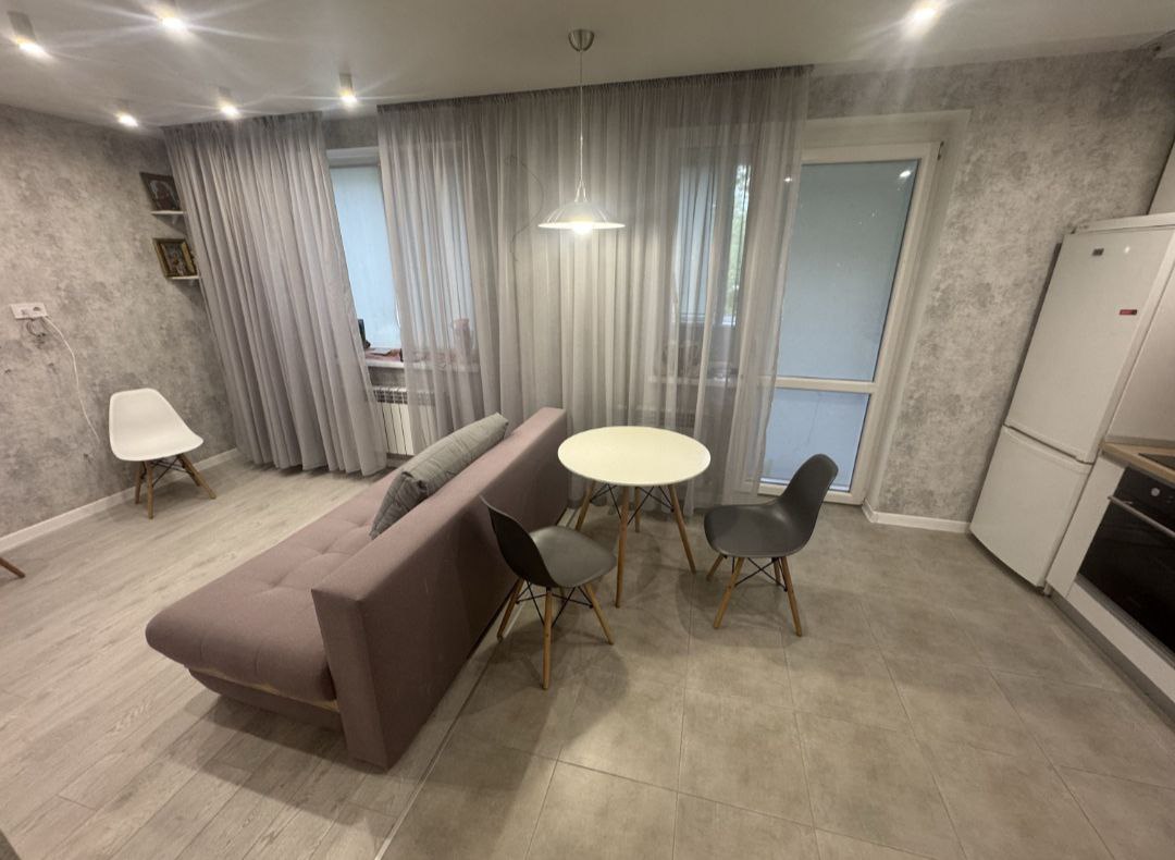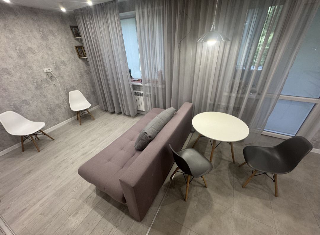 Загальна площа – 38 кв м, формат: студія, кухня-вітальня – 19 кв м, окремо зона спальні – 10 кв м, сан вузол спільний, висота стелі 2.7м.