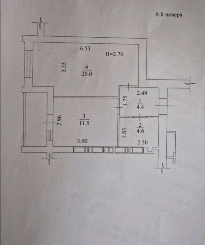 Загальна площа – 42,5 кв.м, простора кімната – 20,0 кв.м, простора кухня – 11,5 кв. м із виходом на балкон, сан вузол спільний, висота стелі 2.7м.