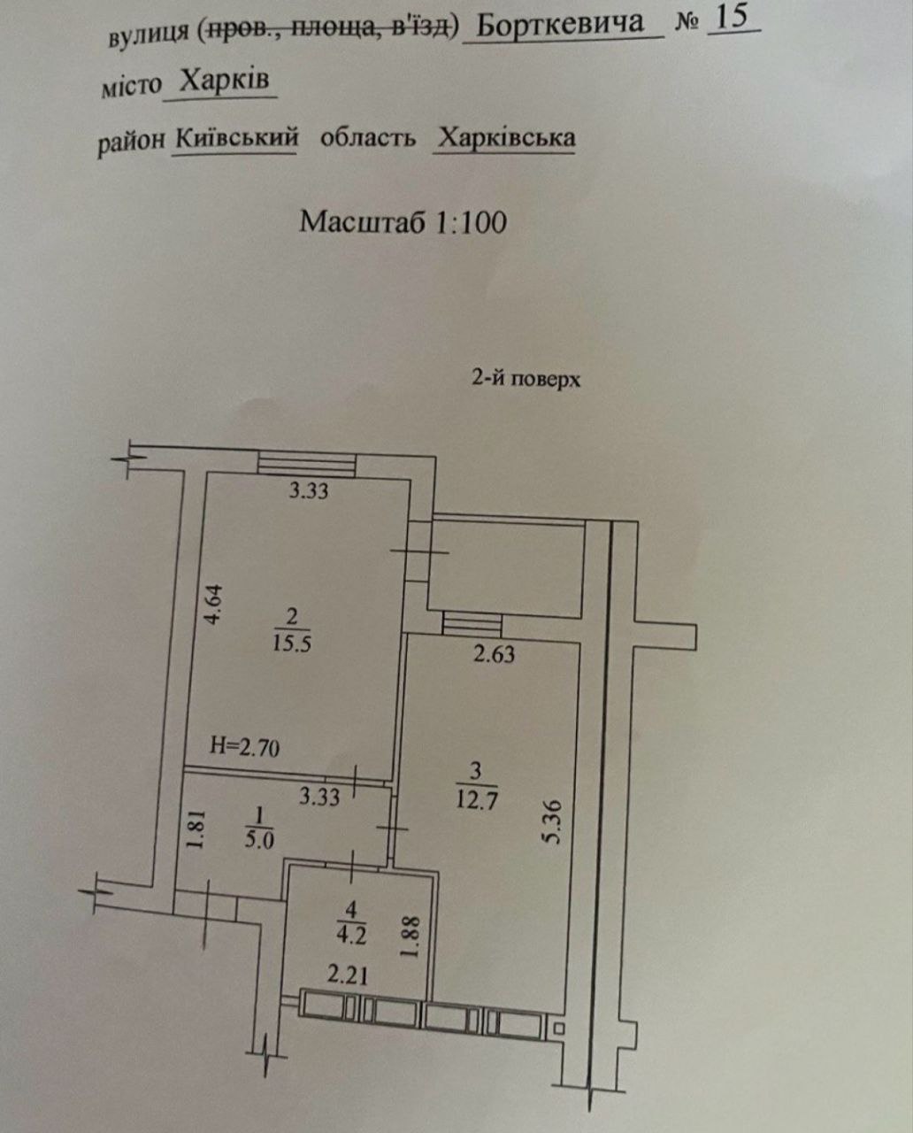 Загальна площа квартири – 40.5 кв.м, кімната – 15.5 кв м з виходом на балкон, простора кухня – 12.7 кв.м, сан вузол сумісний, висота стель 2.7м.