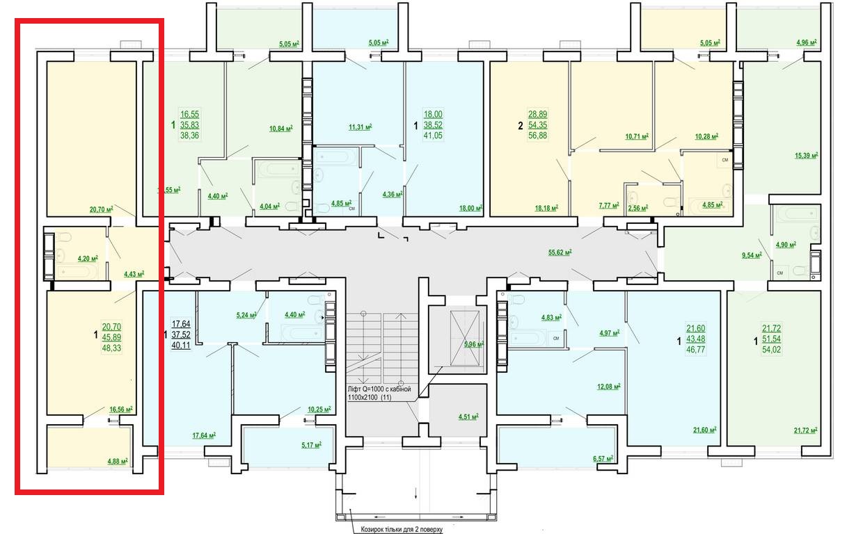 Загальна площа квартири – 48.7 кв.м, простора кімната – 21 кв, простора кухня – 16.6 кв.м з виходом на балкон, санвузол спільний, висота стель 2.7м.