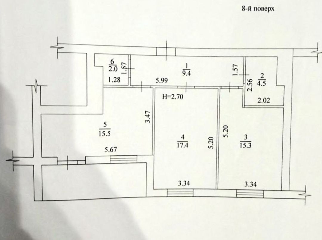 Загальна площа квартири – 68 кв.м, 2е роздільні кімнати – 17.4 кв. м та 15.3 кв. м, простора кухня – 15.5 кв. м з виходом на лоджію, 2 санвузли, просторий коридор, висота стель 2.7м.