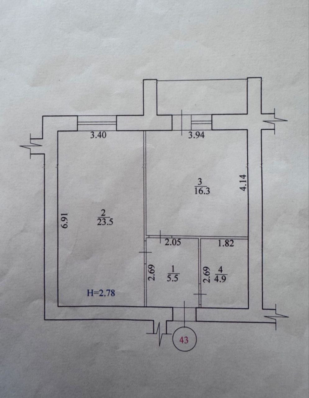 Загальна площа квартири – 53 кв м, простора кімната – 23.5 кв м, простора кухня – 16.3 кв м з виходом на балкон, спільний санвузол, висота стель 2.7 м.