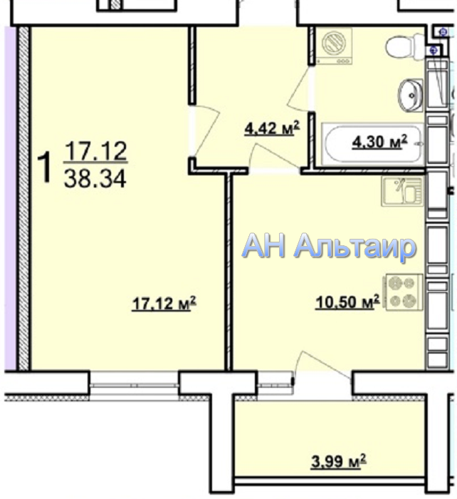 Продам 1 кімнатну квартиру! Загальною площею – 38,5 м.кв., кімната – 17,5 м.кв., простора кухня – 10,5 м.кв.
