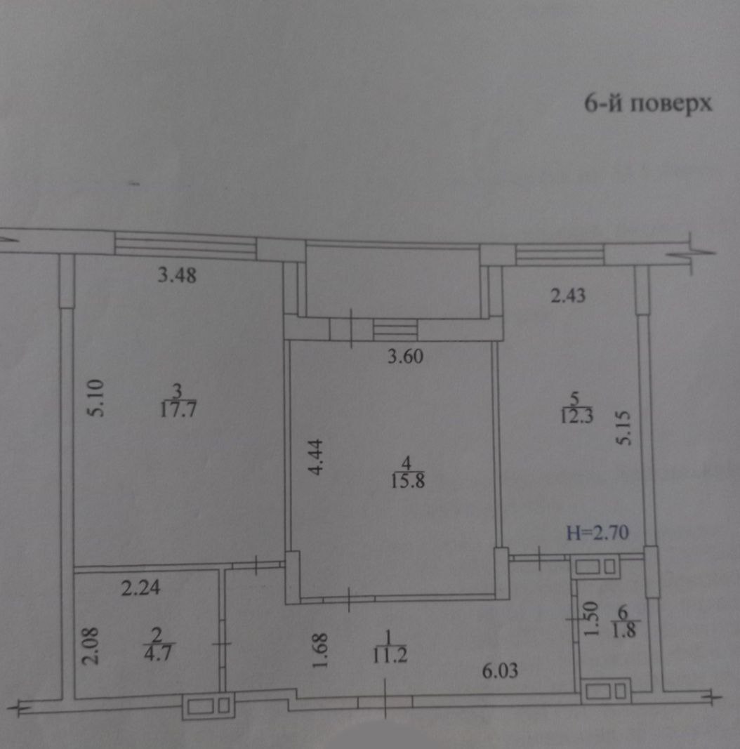 Загальна площа квартири – 65 кв м, 2-і роздільні кімнати – 15.8 кв м з виходом на балкон і 17.7 кв м, простора кухня – 12.3 кв м, 2 сан вузли, просторий коридор, висота стелі 2.8м.