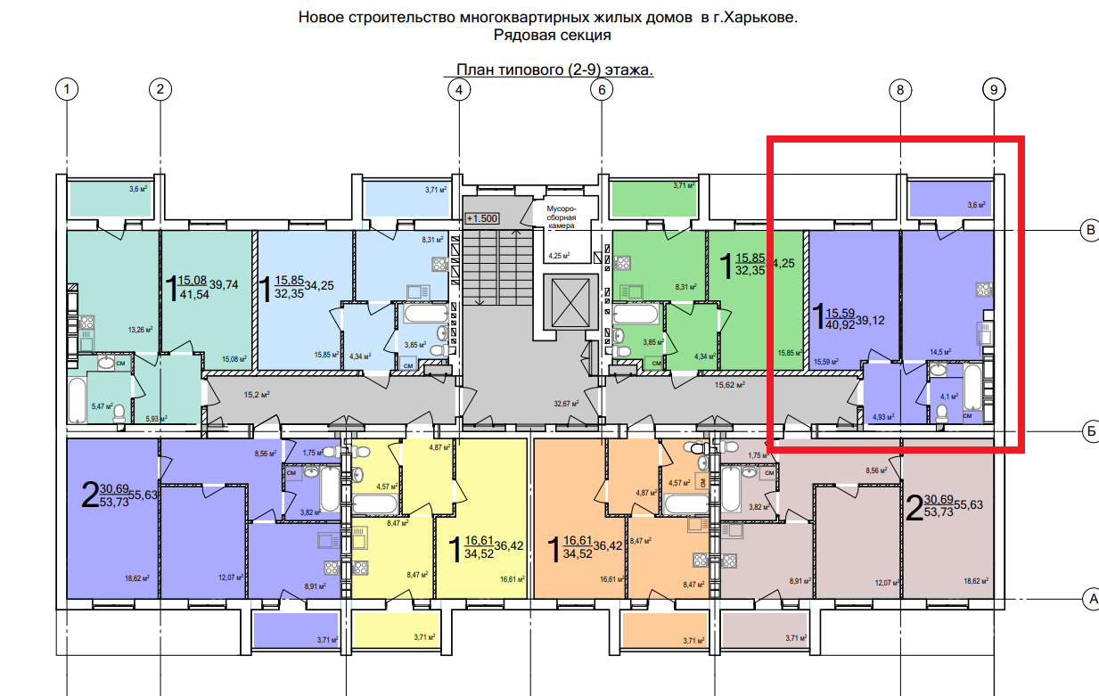Загальна площа квартири – 40.92 кв.м, кімнати – 15.59 кв.м, простора кухня – 14.5 кв.м із виходом на балкон висота стелі 2.7м.